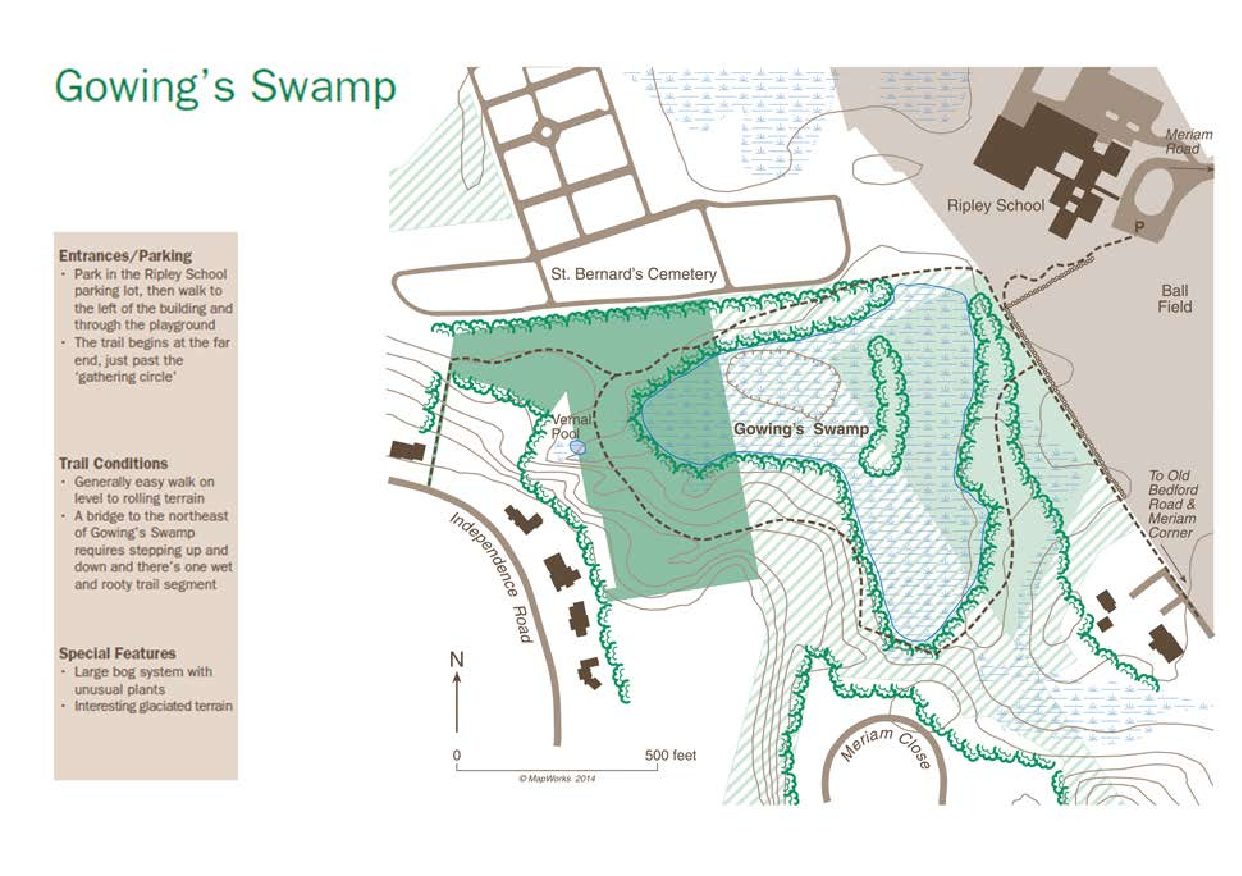 Entrances/Parking: Parking is available at Ripley School on Meriam Road. Trails are found past the playground on the south side of the school. There is also a marked trailhead on Independence Road.